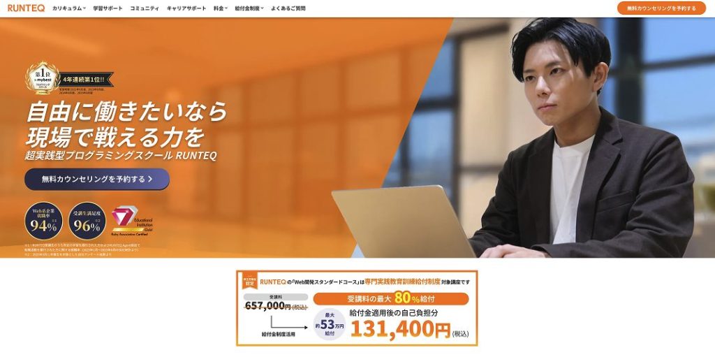 RUNTEQは、自社開発企業への転職を目指す人に向けたプログラミングスクールです。