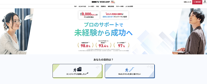 DMM WEBCAMPは、オンライン完結型で未経験からエンジニアを目指せるプログラミングスクールです。