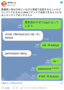 こちらは少し話題になったTwitterの切り取りですが、UNIXコマンドというものを使って会話が成立しています。こういうの、エンジニアは大好きです。
