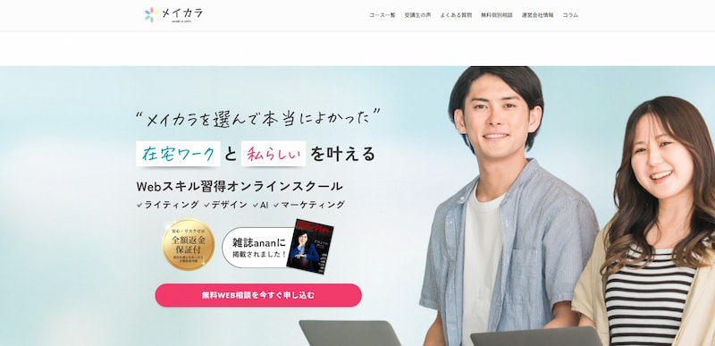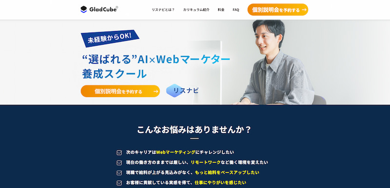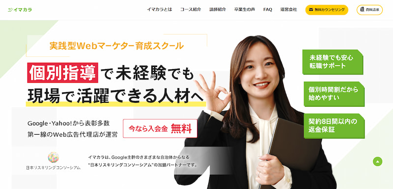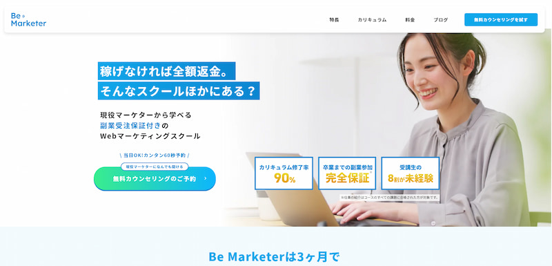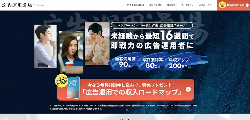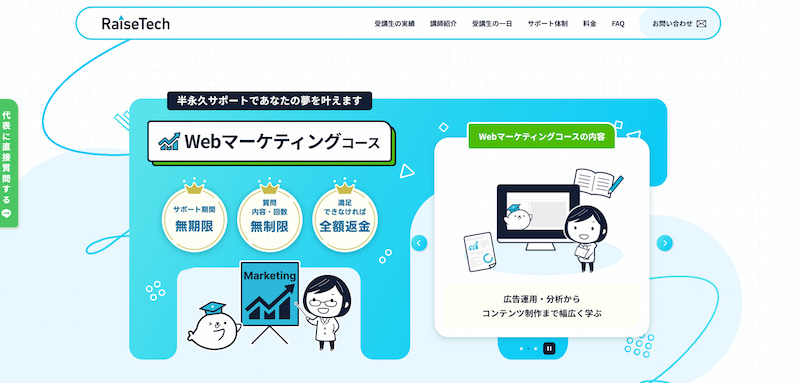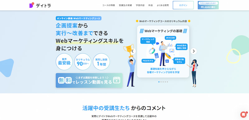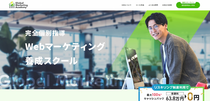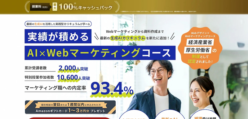 講師は多くのクライアントを抱える現役Webマーケターが担当し、個別面談・無制限チャット質問対応など手厚いサポートも充実しています。